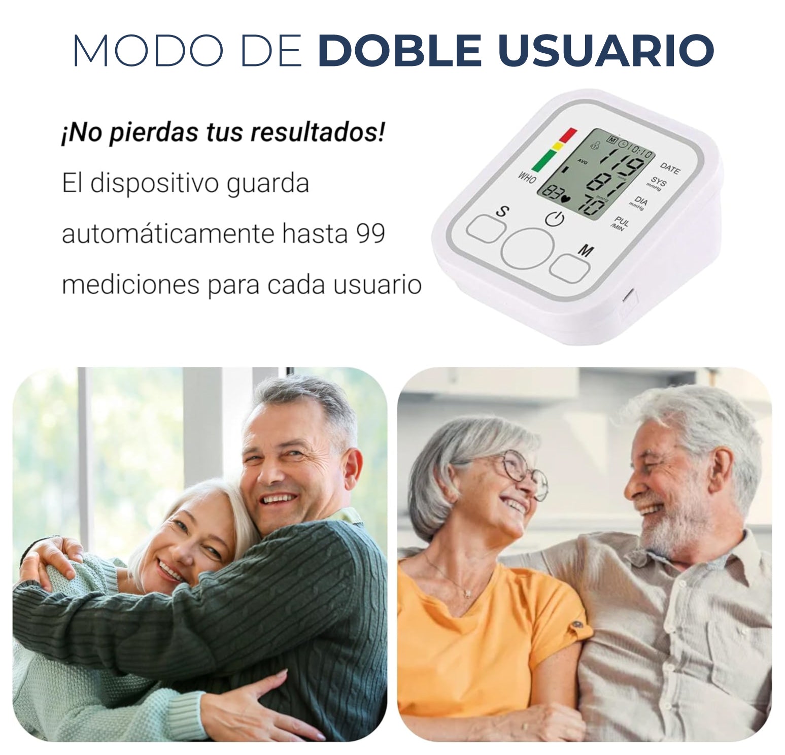 - Memoria para dos usuarios: Almacena hasta 120 lecturas para dos usuarios, permitiendo un seguimiento detallado de tu salud y la de tu pareja.